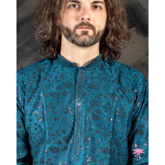 Teal Blue Embroidered Kurta Set – Elegant Men’s Festive Kurta with Intricate Embroidery