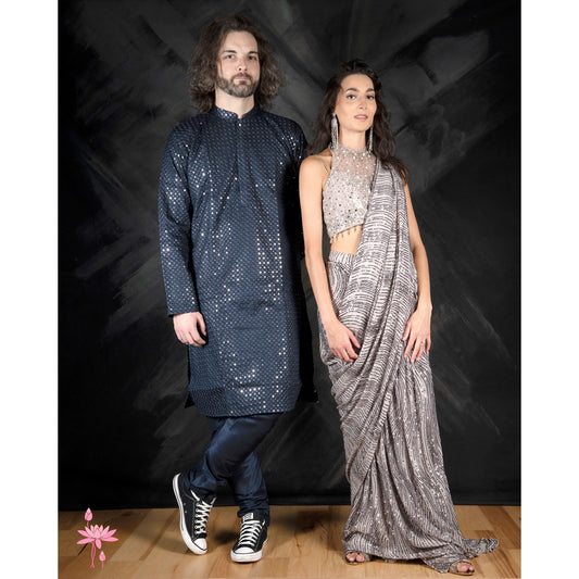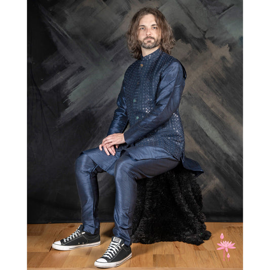 Blue Men’s Kurta with Nehru Jacket & Mirror Work